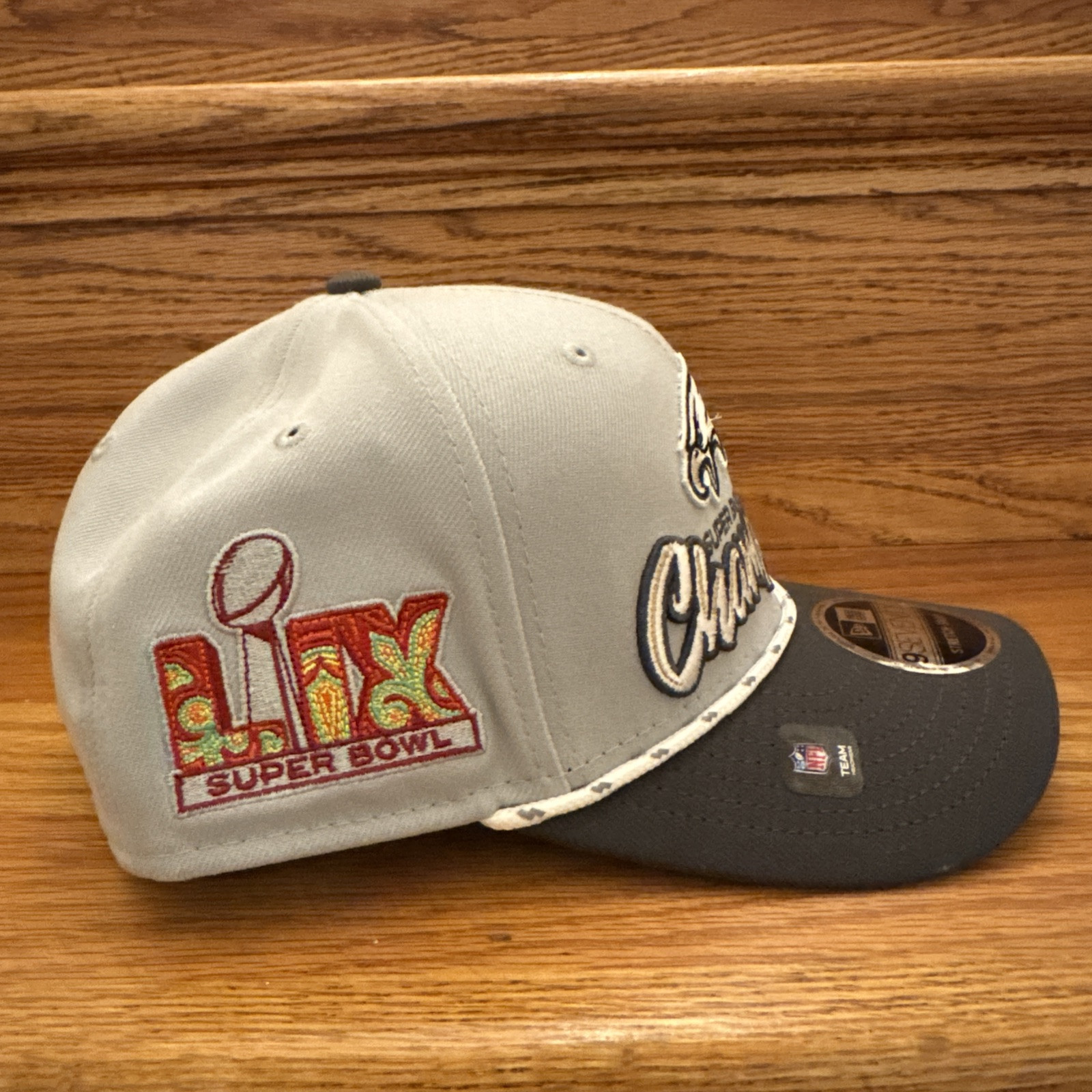 This is a New Era hat officially licensed by the National Football League (NFL) celebrating the Philadelphia Eagles as Super Bowl 59 (LIX) Champions. The hat is in gray color with the team's logo and is designed in the 9SEVENTY Locker Room style for men. It is a one size fits all product suitable for football fans looking to show their support for the Eagles.