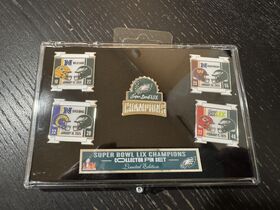 This product is a 5-piece pin set by WinCraft celebrating the Philadelphia Eagles as the Super Bowl LIX champions in the NFL. It is officially licensed and features the team's logo and design. Perfect for fans looking to collect souvenirs or show their support for the Eagles' victory.